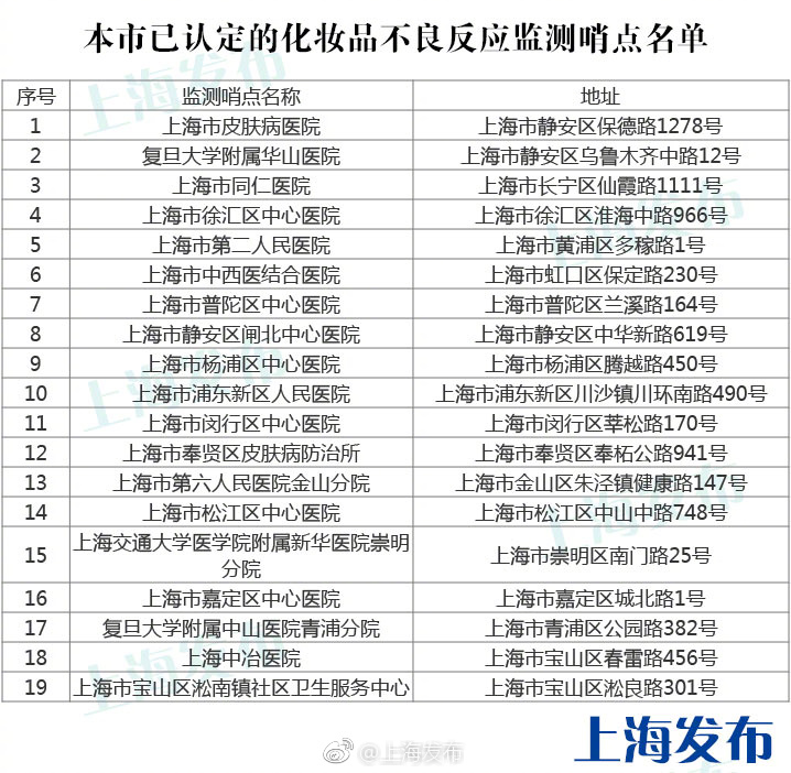 【你對(duì)化妝品產(chǎn)生過不良反應(yīng)嗎?這份監(jiān)測(cè)哨點(diǎn)名單你一定要收好!】//【你對(duì)化妝品產(chǎn)生過不良反應(yīng)嗎?這份監(jiān)測(cè)哨點(diǎn)名單你一定要收好!】#便民提示#有的化妝品可能會(huì)產(chǎn)生不良反應(yīng),需要及時(shí)收集,@上海食藥監(jiān) 和@健康上海12320 推進(jìn)了化妝品不良反應(yīng)監(jiān)測(cè)體系。如果你對(duì)化妝品產(chǎn)生不良反應(yīng),可以就近前往“本市已認(rèn)定的化妝品不良反應(yīng)監(jiān)測(cè)哨點(diǎn)名單”上的站點(diǎn)檢測(cè)及就診哦! ?
