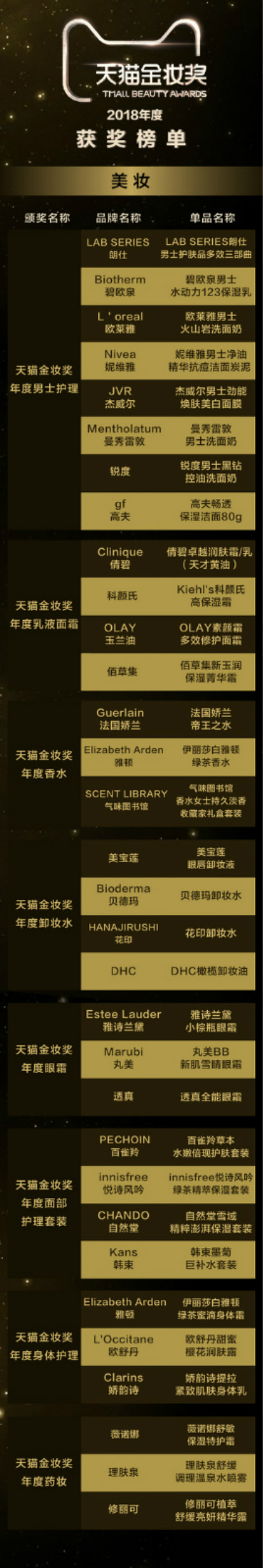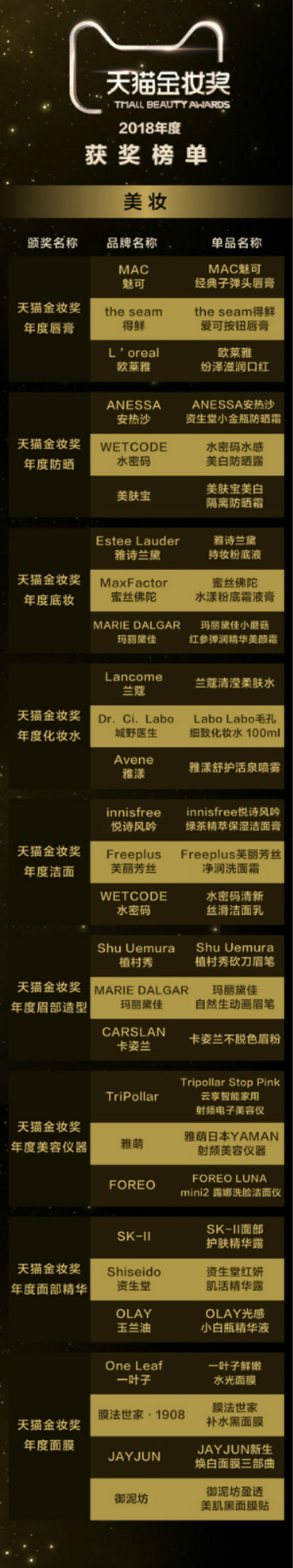 3月4日,2018年天貓金妝獎(jiǎng)在上海舉行。天貓根據(jù)過去一年中平臺(tái)上的搜索、互動(dòng)、好評(píng)率、銷量以及服務(wù)等相關(guān)數(shù)據(jù),對(duì)已入駐的美妝、個(gè)人護(hù)理品牌進(jìn)行了排名。SK-II、雅詩蘭黛、阿瑪尼和紀(jì)梵希被評(píng)為年度超級(jí)品牌。此外,天貓還展示了試妝鏡、無人化妝品販賣機(jī)和智能貨架等新零售美妝技術(shù)。